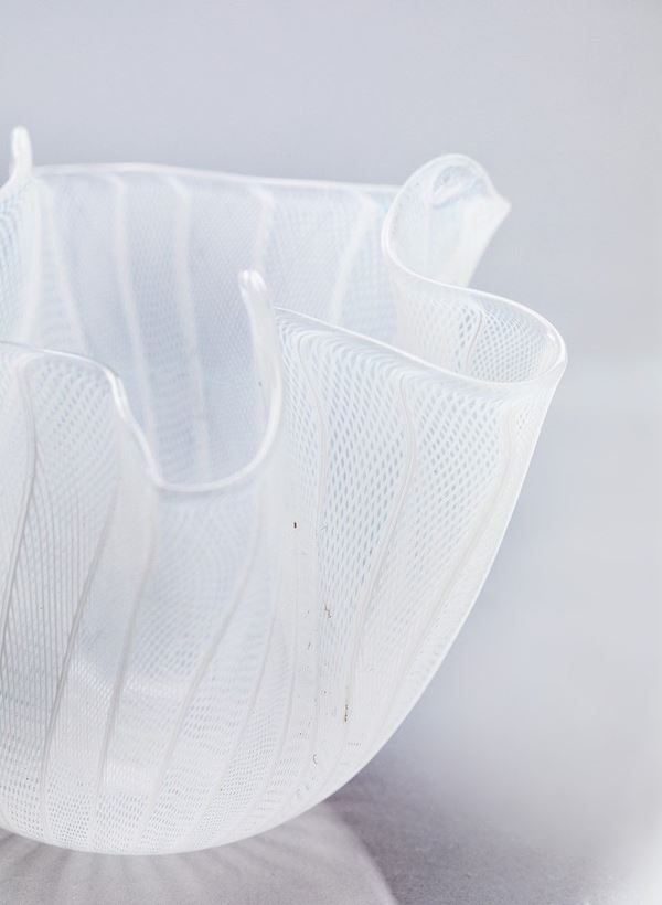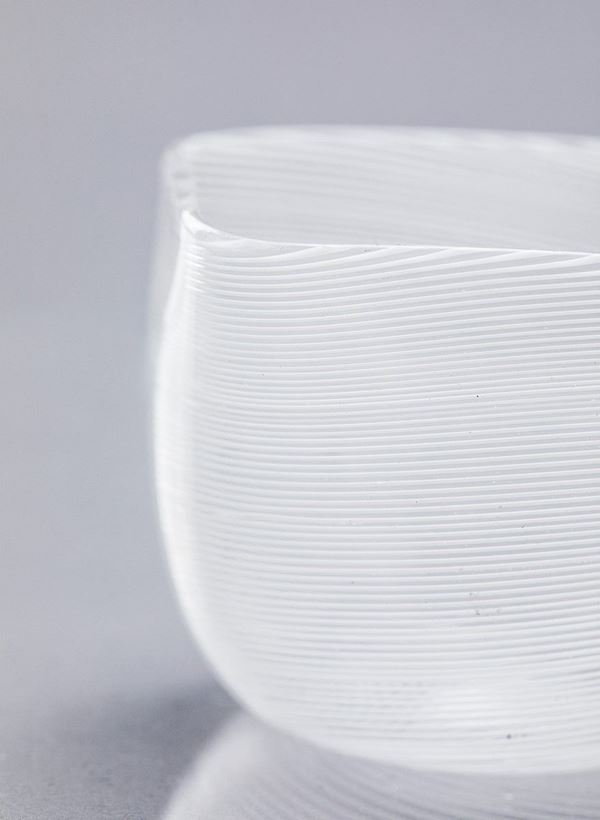Vetro soffiato con decoro a canne zanfirico lattimo.