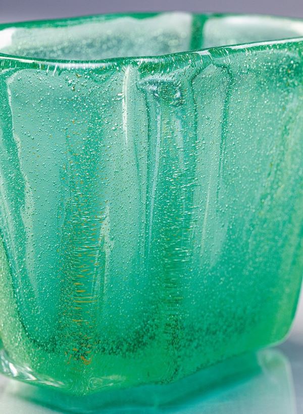 Vetro sommerso verde giada con inclusione di foglia d’oro.