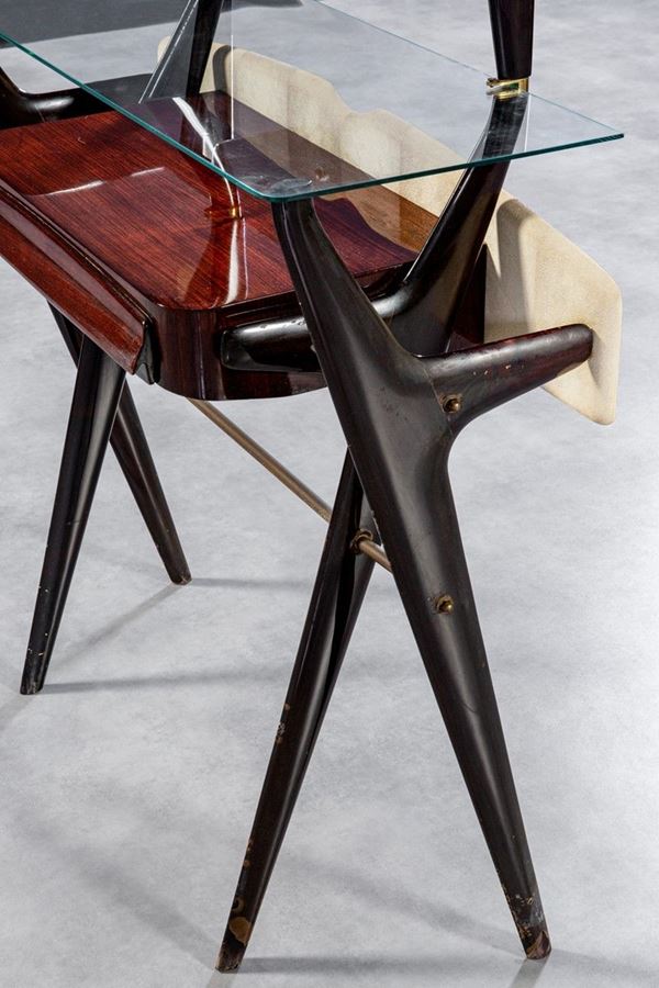 Legno tinto e rivesttto, ottone, cristallo molato e cristallo argentato.