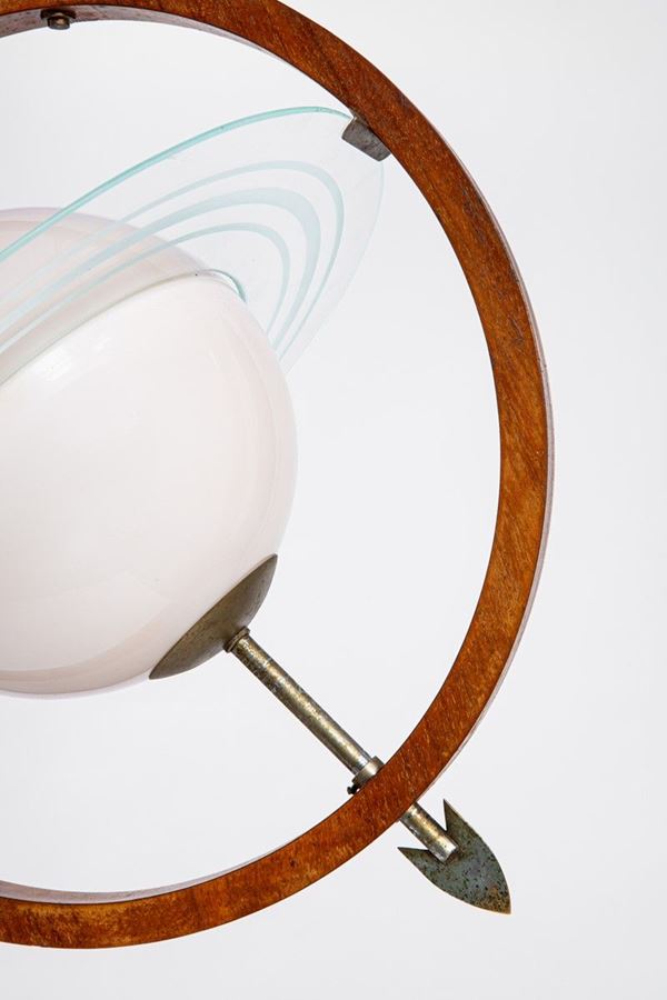 Metallo cromato, vetro opalino, cristallo sagomato, molato e decorato a getto di sabbia, legno.