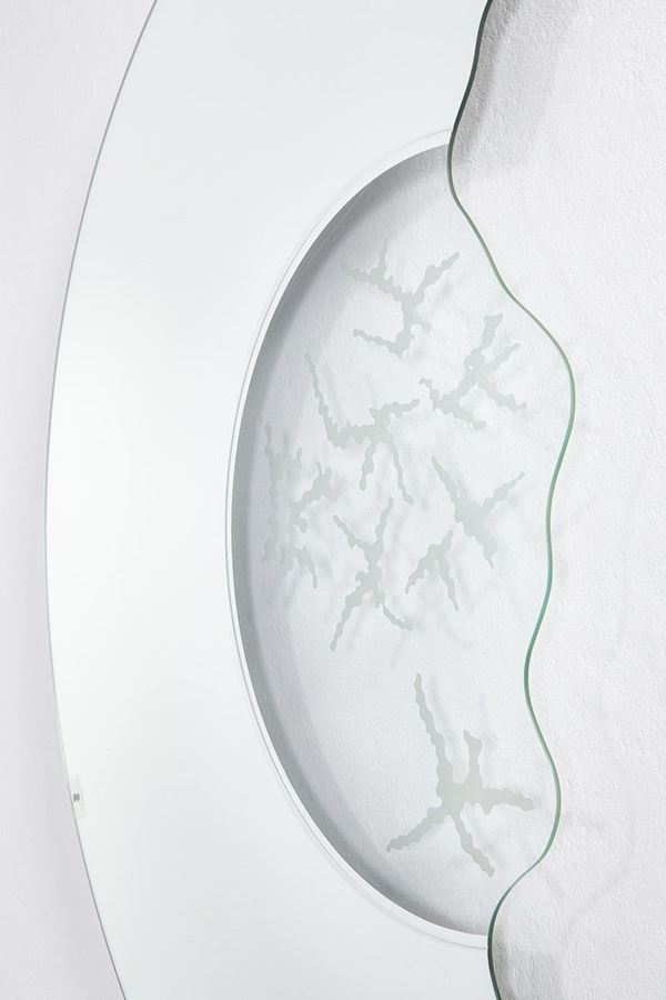 Cristallo sagomato e molato decorato a getto di sabbia e argentato.