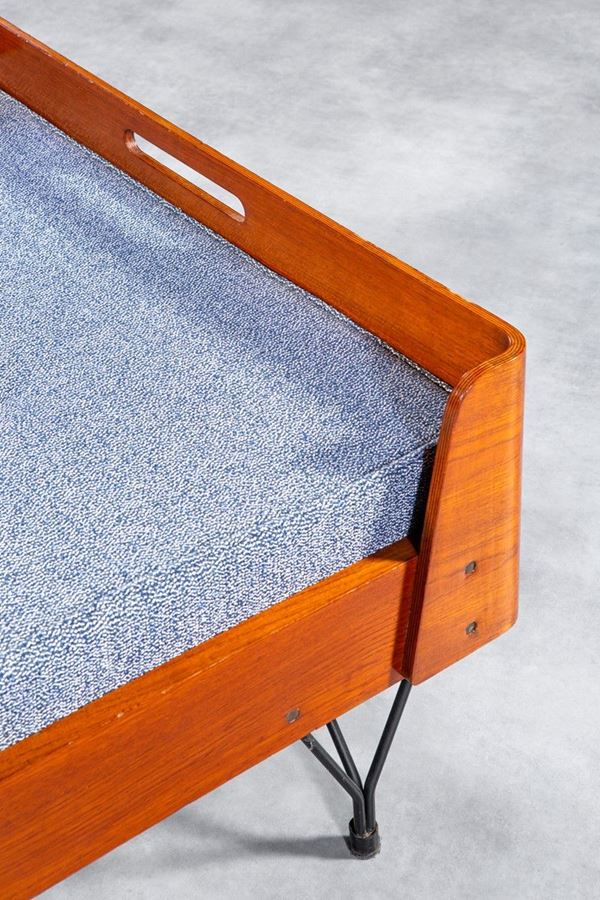 Compensato curvato, legno, tondino metallico smaltato, gommapiuma rivestita in tessuto.