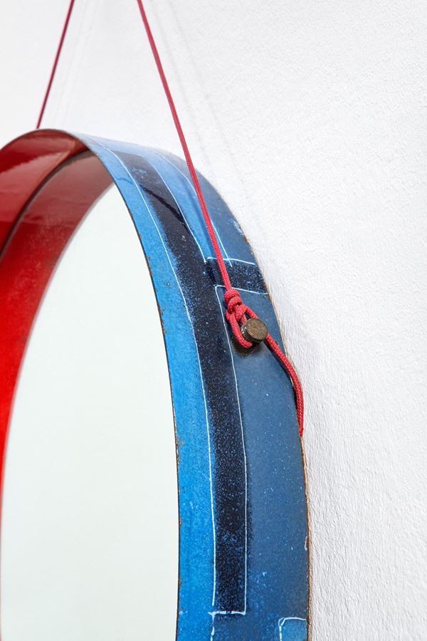 Metallo smaltato, cristallo sagomato ed argentato, ottone, corda.