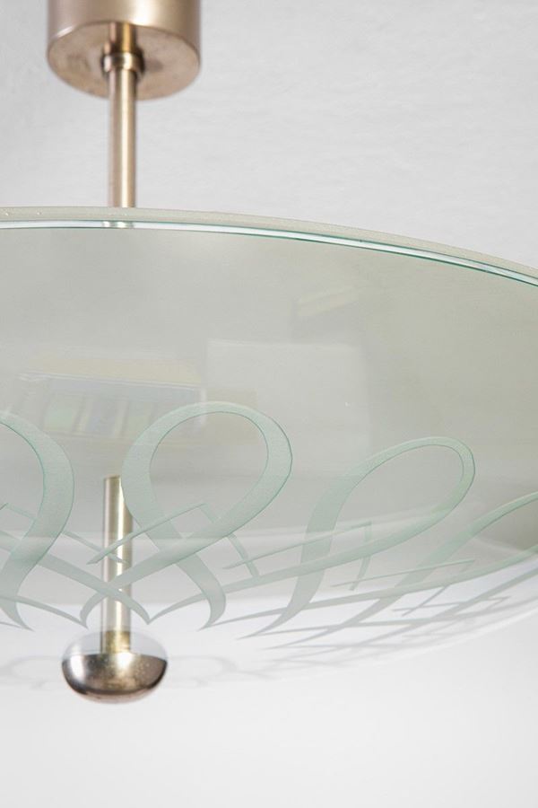 Ottone nichelato, cristallo decorato a getto di sabbia e curvato, cristallo satinato.