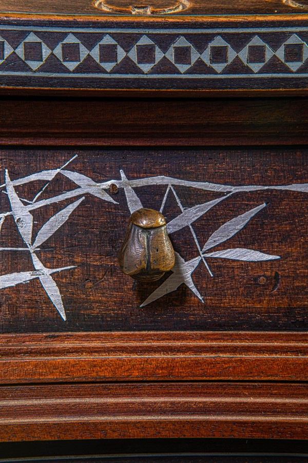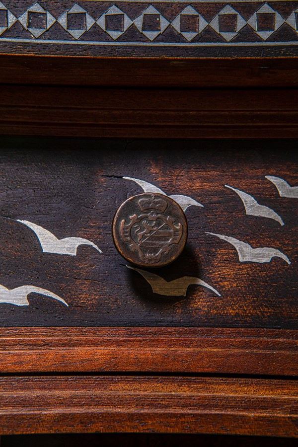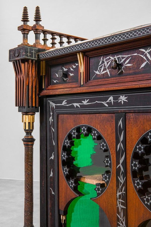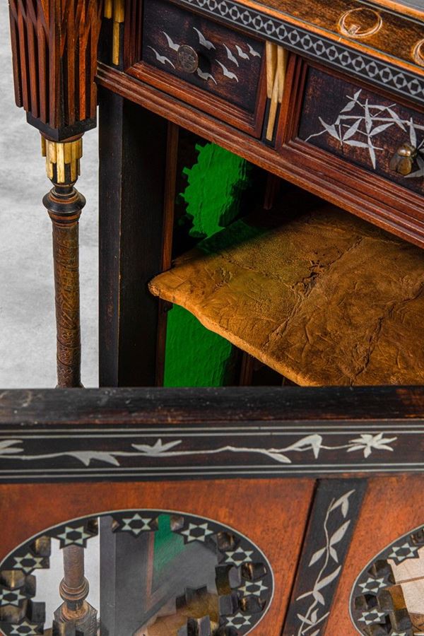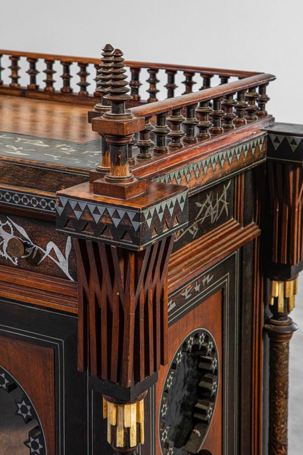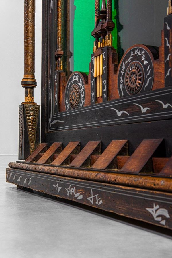Legno di noce ebanizzato, rame sbalzato, intarsi in peltro, madreperla, osso, ottone, cristallo trasparente e colorato.
