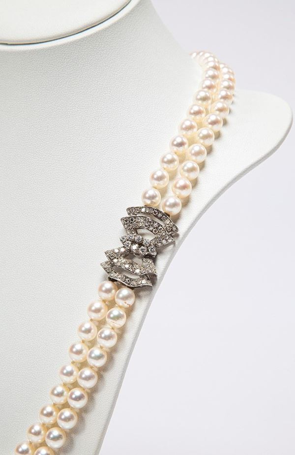 Collana a due fili di perle 8mm, fermezza a fiocco in oro bianco 750/00 e brillanti di ct 1.30 circa.