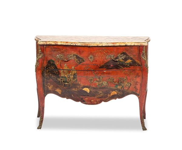 Comò di forma mossa a due cassetti senza traversa dipinto a cineserie dorate su fondo rosso. Piano in marmo.