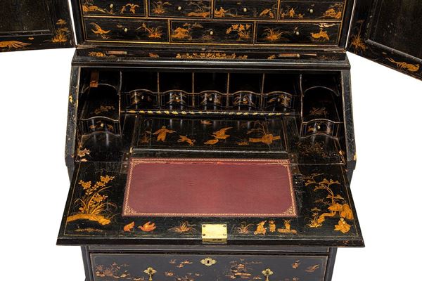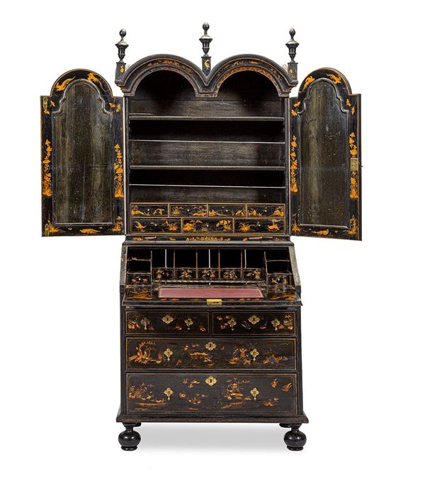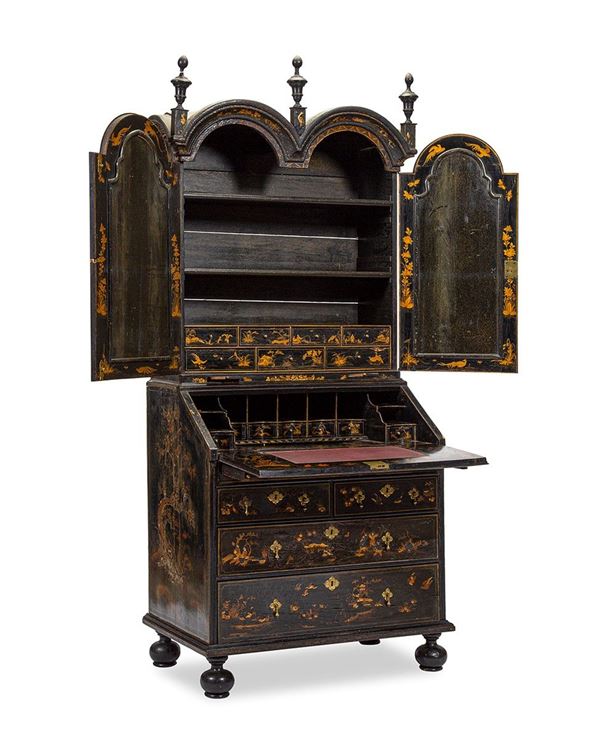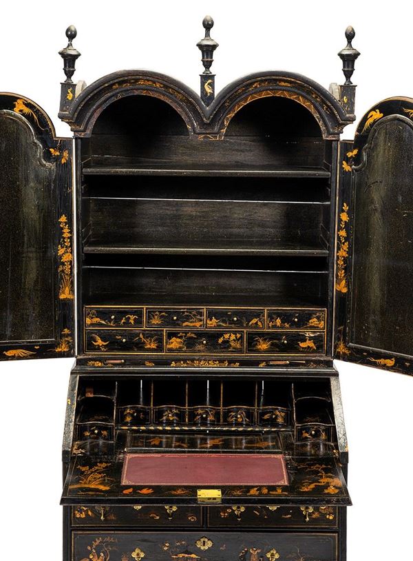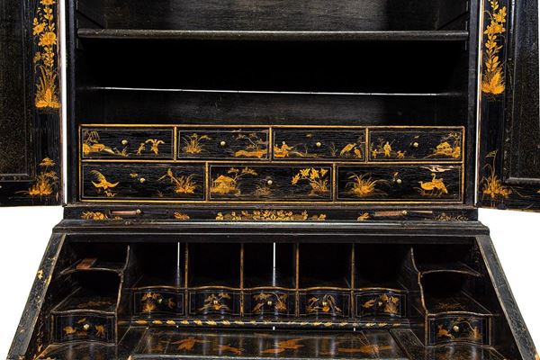 Doppio corpo in legno laccato a fondo nero e decorato a cineserie.