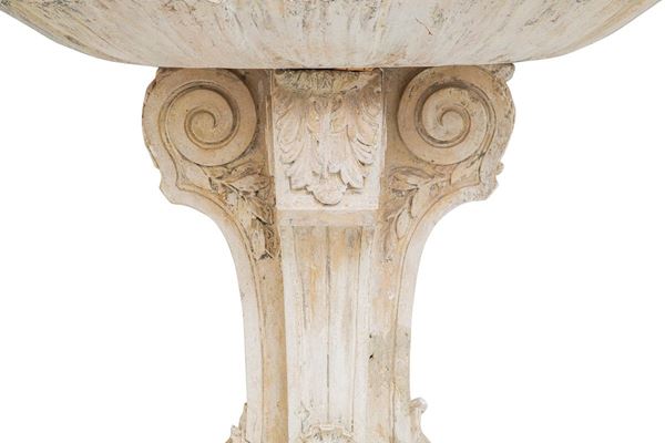 Fontana da muro in pietra tenera di gusto classico, divisa in tre sezioni, vasca scolpita a forma di conchiglia su supporto monopode. Placca superiore mistilinea e centrata da un putto che si adagia su Tritone. Alcune rotture.