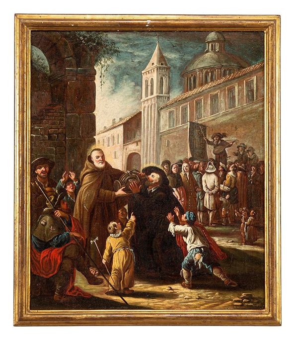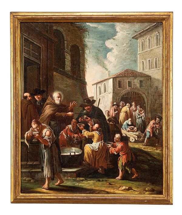 A titolo di esempio e per confronto, ricordiamo la tela con commedianti e l’incontro di san Felice con san Filippo, firmata 1754 e datata dal Graneri ed oggi a Palazzo Mazzetti ad Asti, nella quale la scena centrale dell’incontro dei santi è praticamente identica, con variazione del contesto in cui però compaiono anche i saltimbanchi prediletti dal Graneri. Altre scene analoghe, anche se di minore qualità, sono transitate sul mercato antiquario nel corso dell’ultimo decennio. Anche la tela dell’elemosina trova riscontri precisi fra le opere stesse di Graneri: in particolare con una tela del 1754 già della Galleria Zabert di Torino, e con una seconda tela in collezione privata quasi identica nella struttura compositiva. Le tele sono databili al periodo più giovanile dell’attività del Graneri, fra 1735 e 1740.