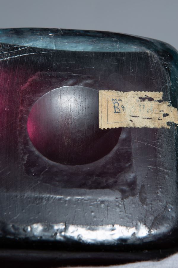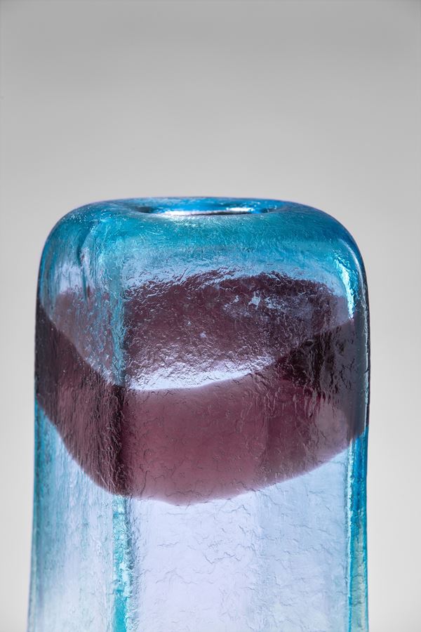 Vetro soffiato turchese con fasce viola applicate e superficie corrosa.