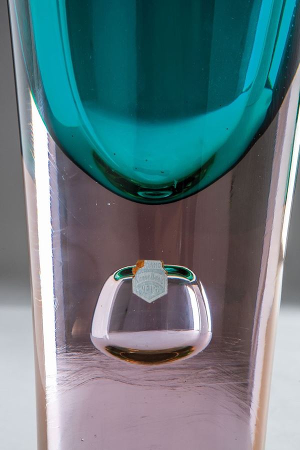 Vetro soffiato blu/rosa con grande bolla d’aria alla base, sommerso.