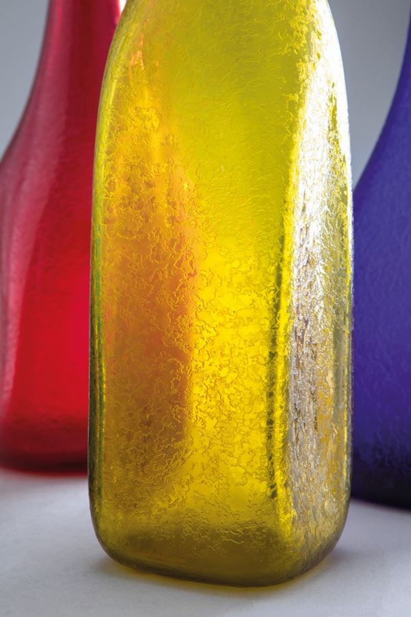 Vetro soffiato di vari colori con superficie corrosa.
