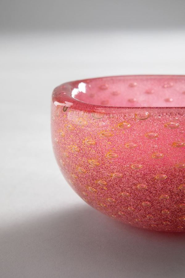 Vetro sommerso ametista con inclusione di regolari bolle d’aria e foglia d’oro.