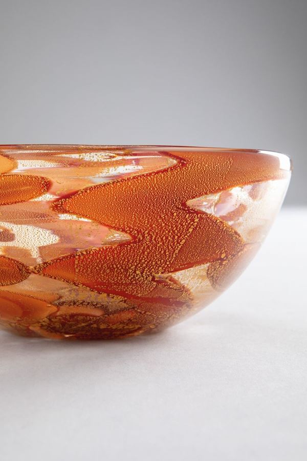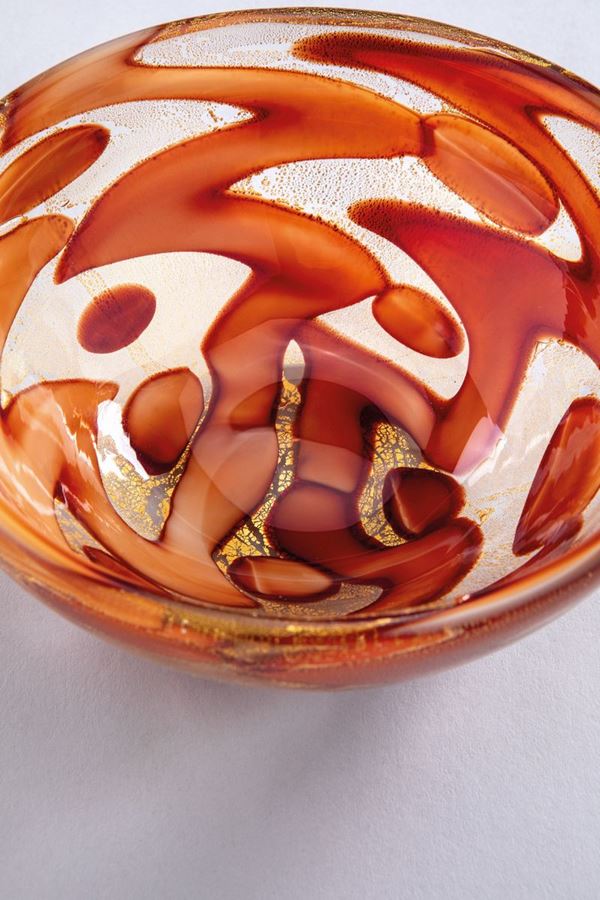 Vetro soffiato incolore con decoro di macchie rosse opache e foglia d’oro.