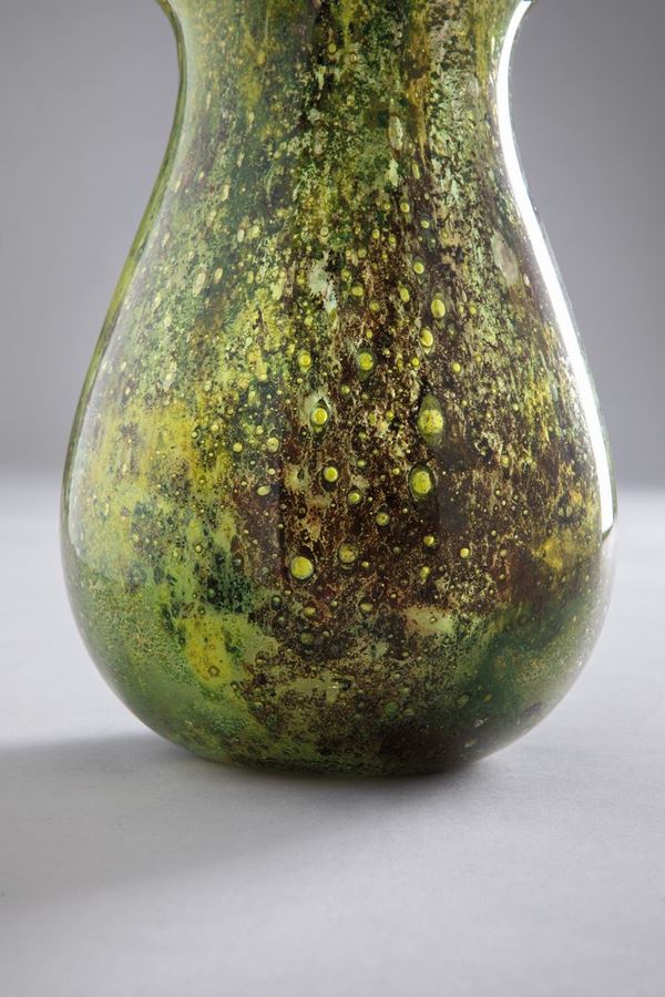 Vetro soffiato di colore verde ramarro ottenuto con la tecnica della colorazione a caldo senza fusione.