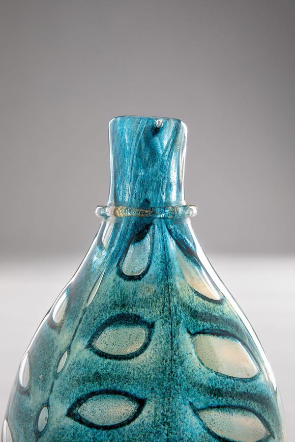 Vetro soffiato cristallo con spirale blu e oro pettinata a festoni.