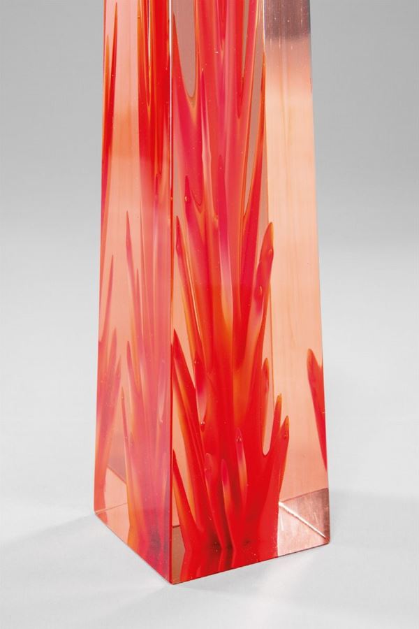 Vetro trasparente incolore con decoro a fiamma in vetro rosso opaco.