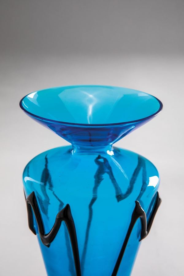 Vetro soffiato in vetro turchese con base a disco e applicazioni in pasta di vetro nera.