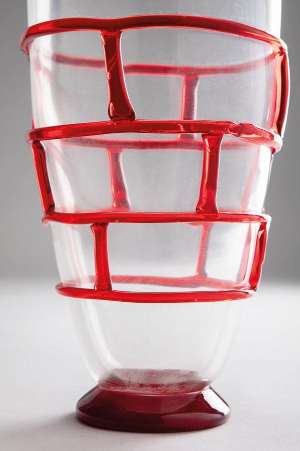 Vetro soffiato cristallo con applicazioni, base in vetro rosso.