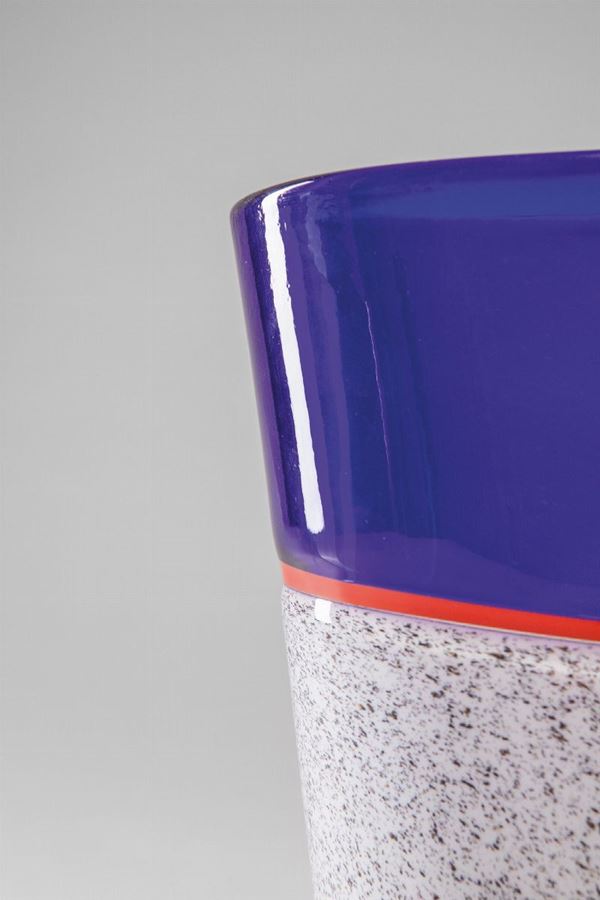 Vetro a doppio incalmo, soffiato blu, rosso e grigio a puntini.