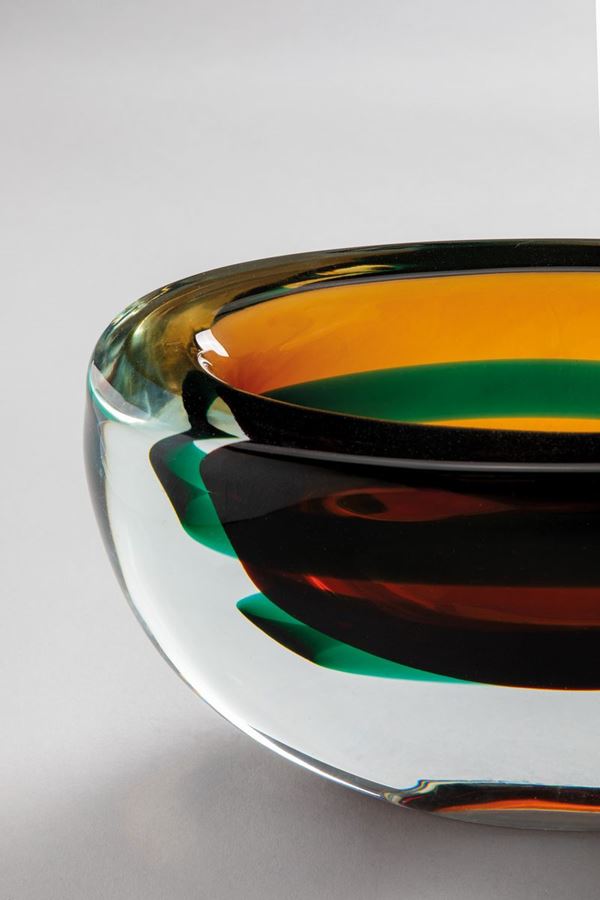 Vetro soffiato cristallo massiccio, con inclusione di canne piatte, sommerso.