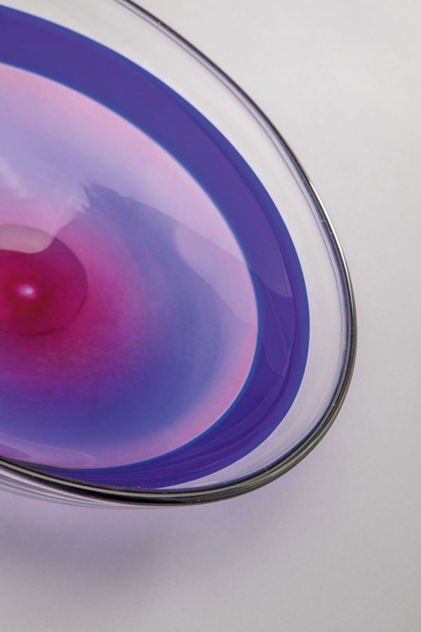 Vetro soffiato cristallo con fascia blu e centro rosa.