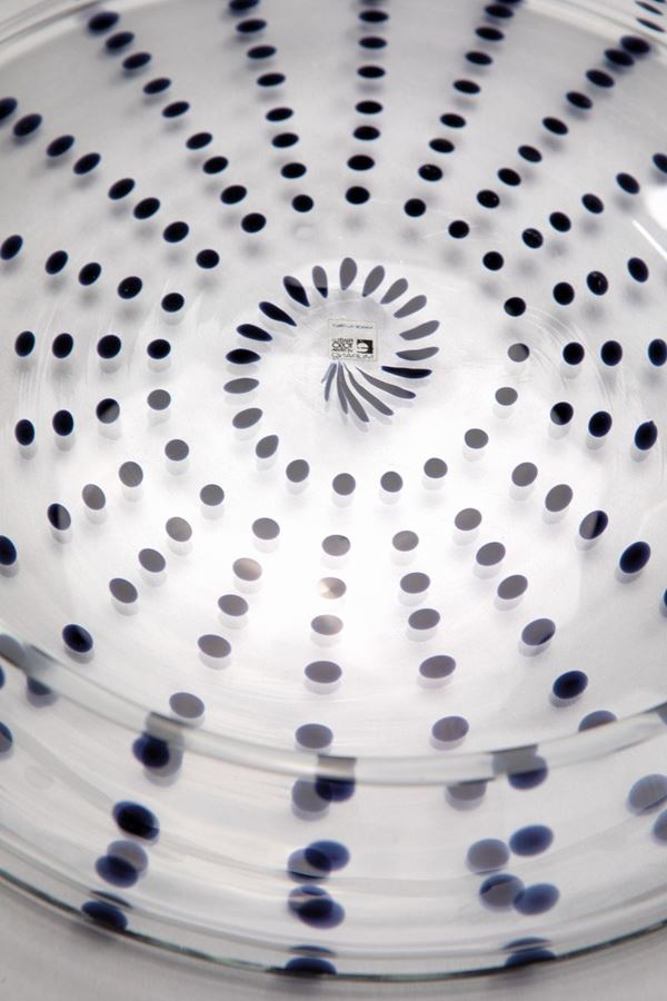 Vetro soffiato cristallo con inclusione di puntini blu disposti a spirale su tutta la superficie.