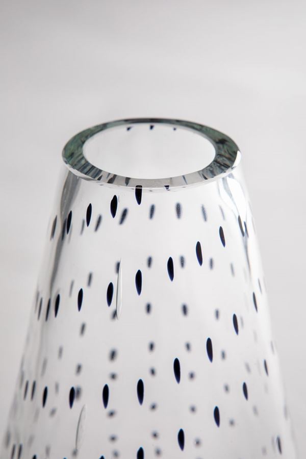 Vetro soffiato cristallo con inclusione di puntini blu disposti a spirale su tutta la superficie.