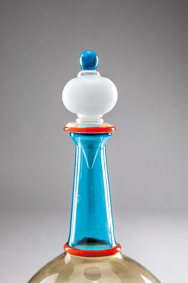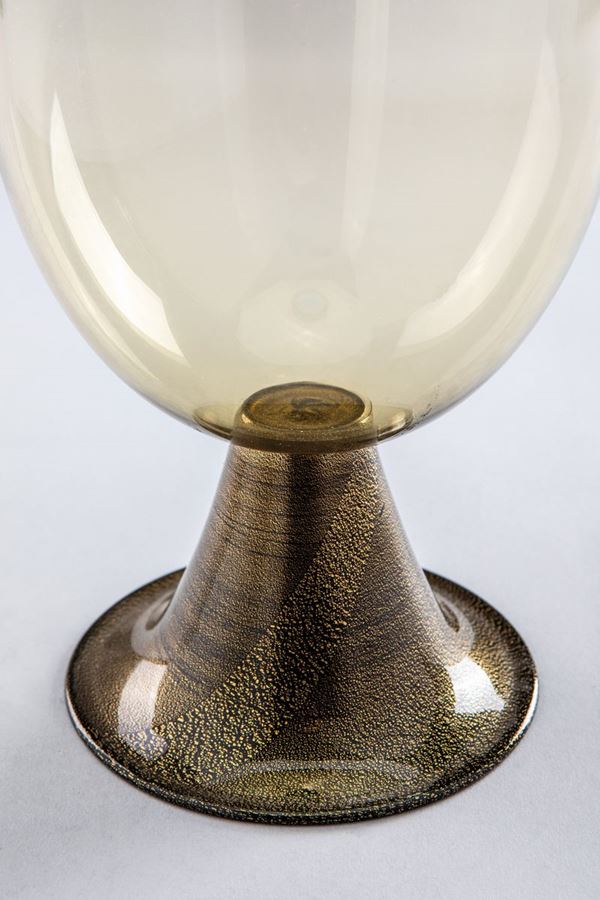 Vetro soffiato fumè con filo corallo, base in vetro nero dorato, con incalmo.