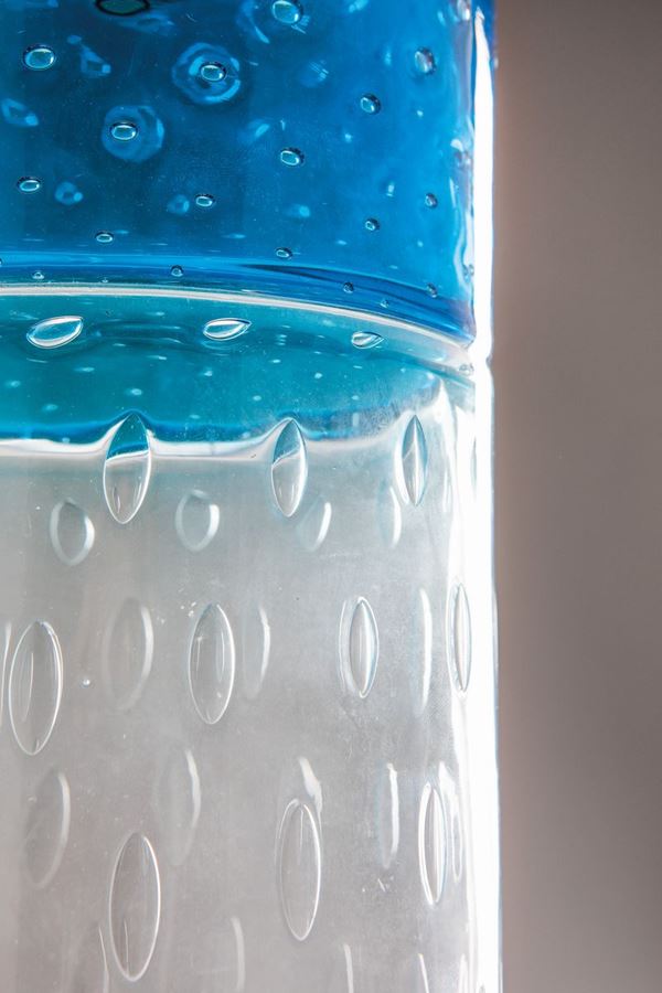 Vetro soffiato ad incalmo in vetro turchese e azzurro con inclusione di bolle d’aria, base nera