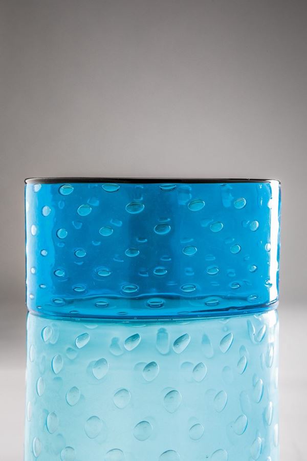 Vetro soffiato ad incalmo in vetro turchese e azzurro con inclusione di bolle d’aria, base nera.
