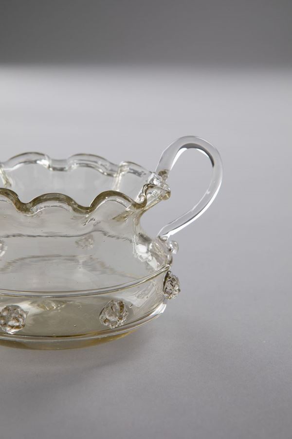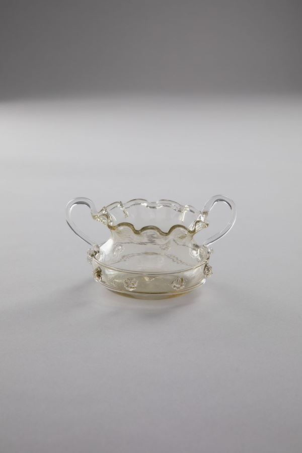 Vetro soffiato cristallo con bocca ondulata e due manici, due fili contornano le morette in vetro applicate a caldo.