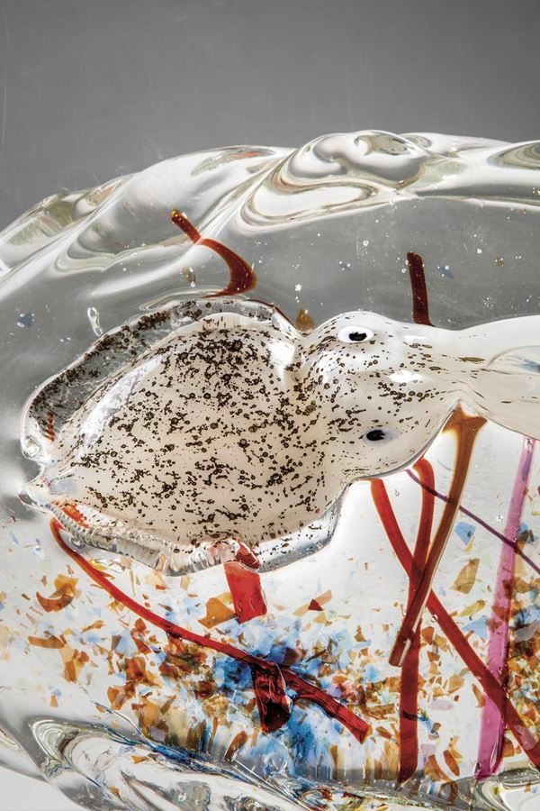 Seppia in pasta vitrea lattimo con polveri inserita in vetro cristallo con sommersioni policrome.