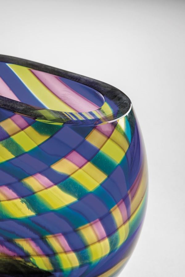 Vetro soffiato a canne piatte incrociate nei toni del rosso, blu e giallo.