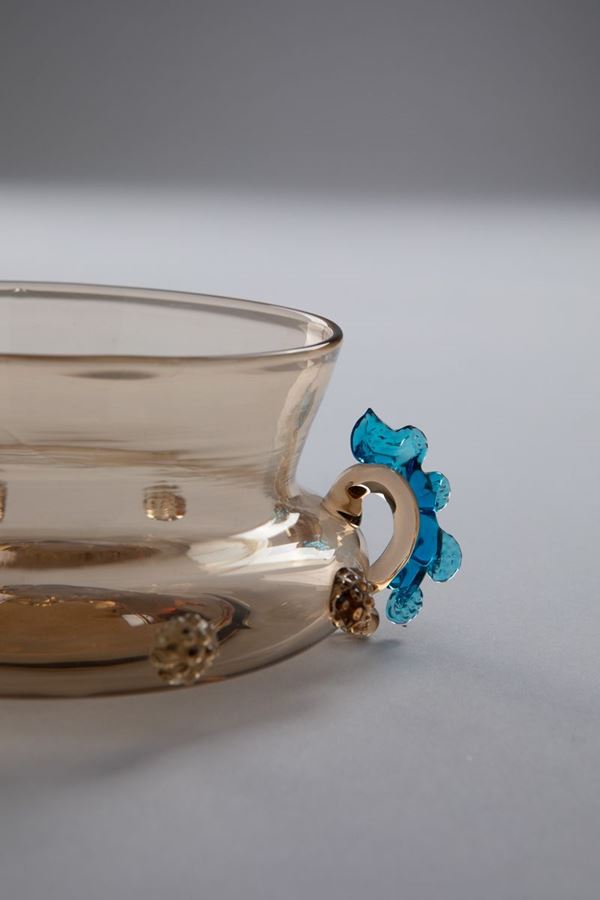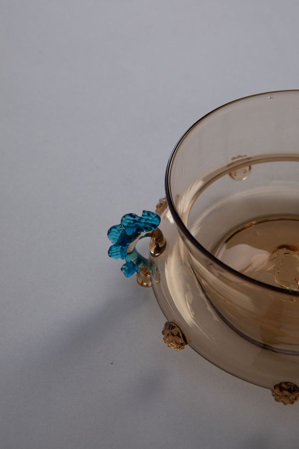 Vetro soffiato fumè con ampia bocca e due manici applicati a caldo decorati da morise acquamare, morette fumè applicate a caldo.