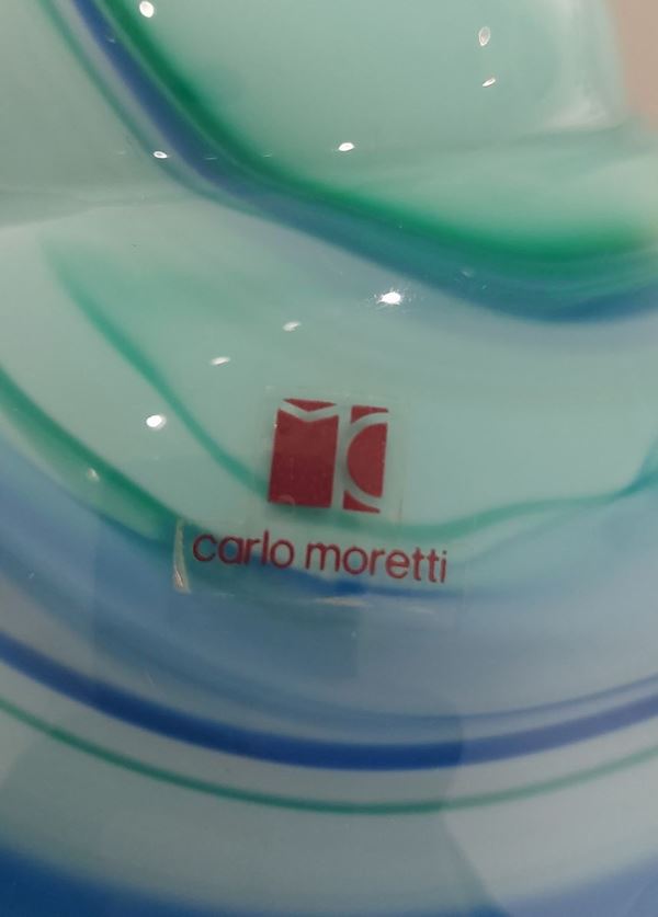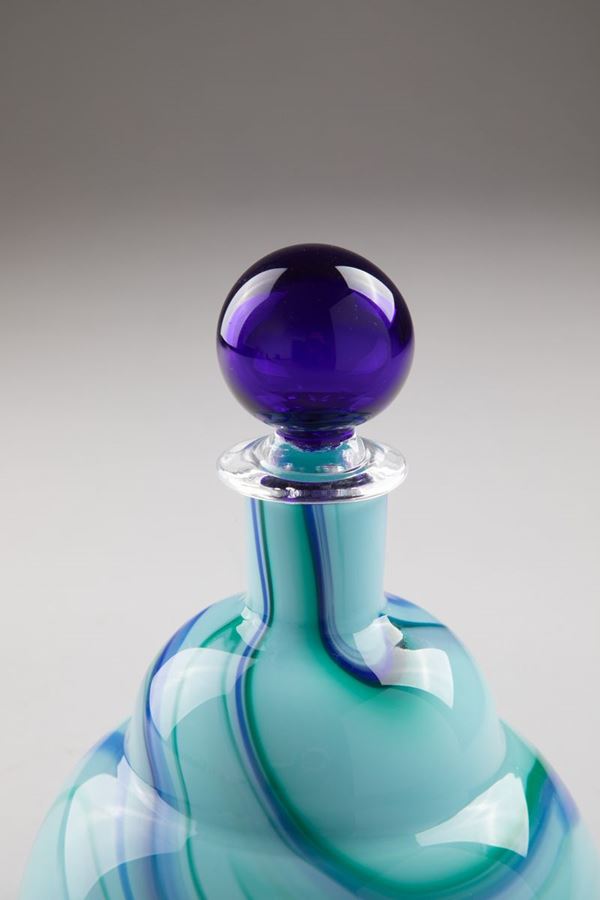 Vetro soffiato con venature policrome, tappo sferico blu.