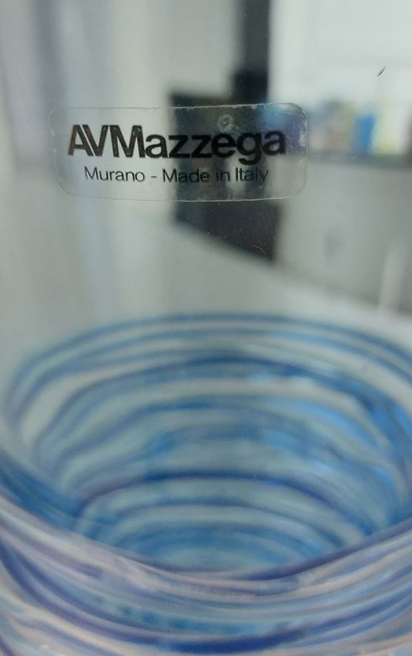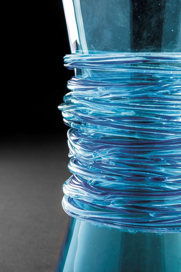 Vetro soffiato cristallo con fili blu applicati a caldo sulla parte centrale.