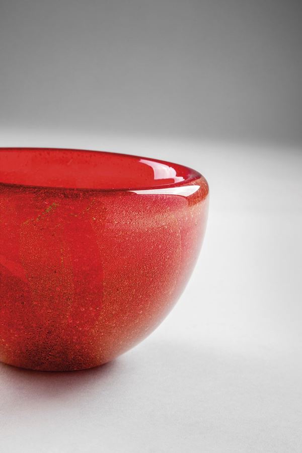 Vetro soffiato rubino con inclusione di foglia d’oro.