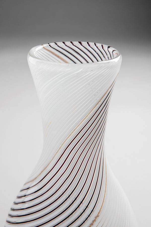 Vetro soffiato con decoro a canne bianche, nere e avventurina; piede in pasta vitrea nera applicato a caldo.