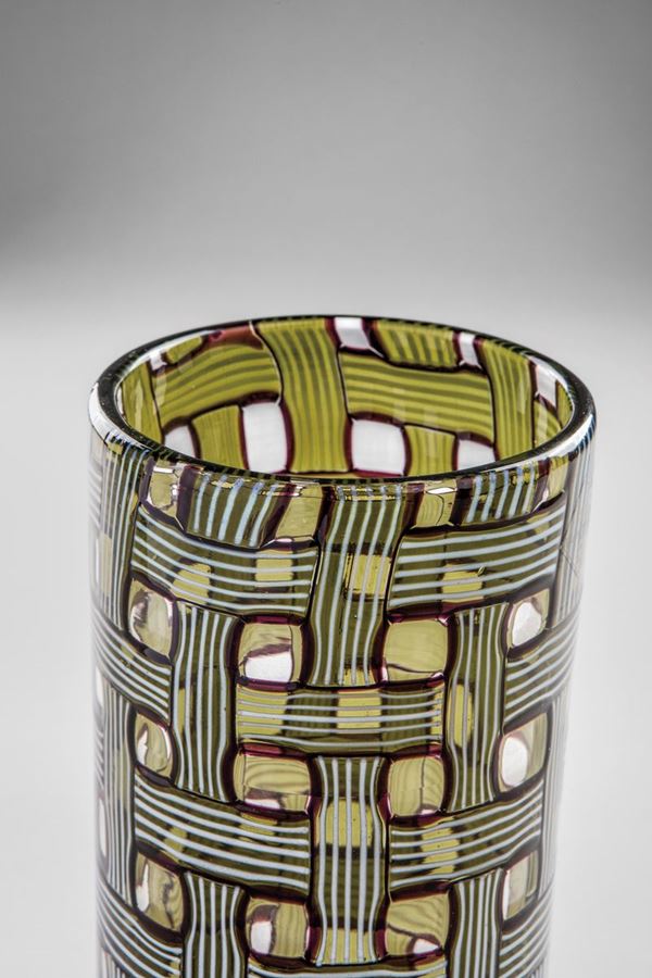 Vetro soffiato con tessuto a reticolato ottenuto intersecando sottili canne a sezione quadrata.