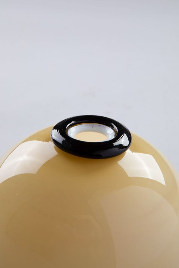 Vetro soffiato incamiciato pagliesco con base e collo in pasta vitrea nera applicati a caldo.