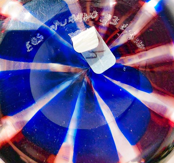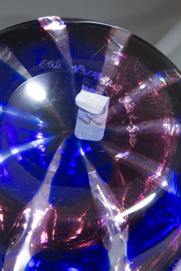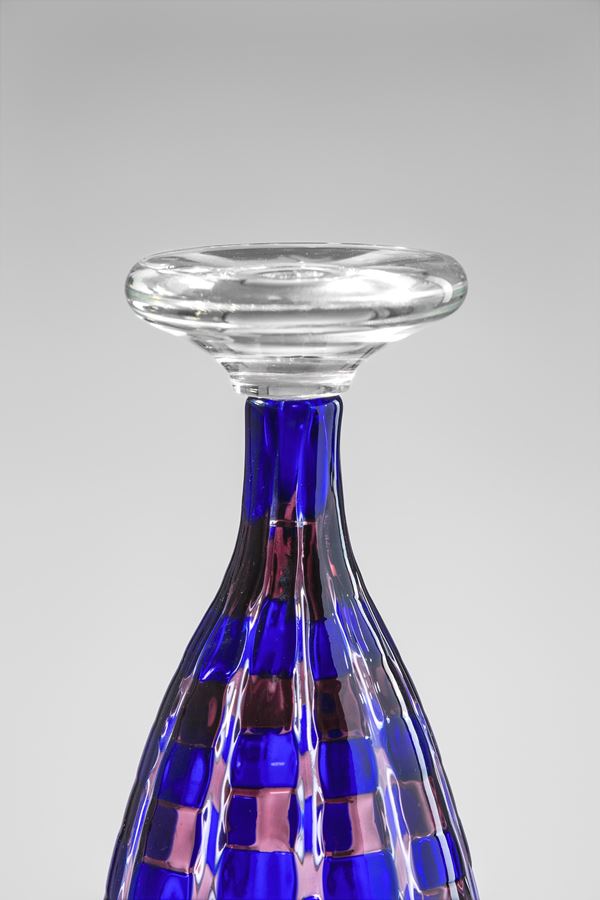 Vetro soffiato a canne blu lilla, tappo in cristallo.