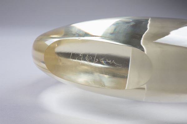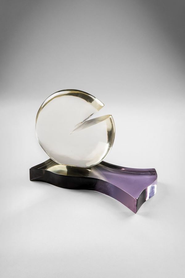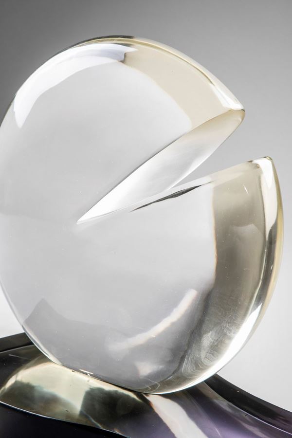 Vetro soffiato cristallo con profonda incisione, base ondulata in vetro massello sfumato nei colori lilla e grigio.