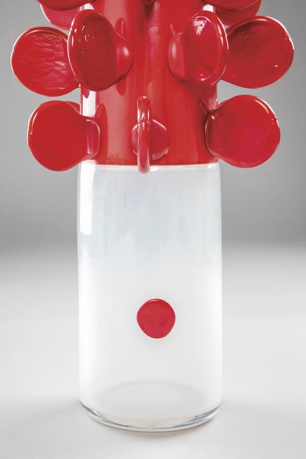 Vetro cristallo soffiato, parte inferiore iridata, parte superiore rosso geranio con applicazioni.
