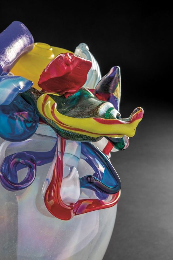 Vetro soffiato iridato con applicazioni a caldo di ritagli in vetro policromo.