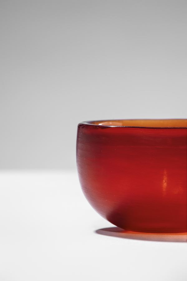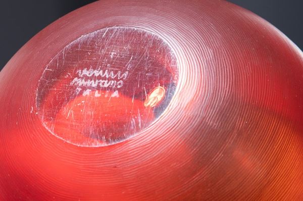 Vetro soffiato di grosso spessore rifinito da leggere incisioni orizzontali.
