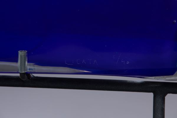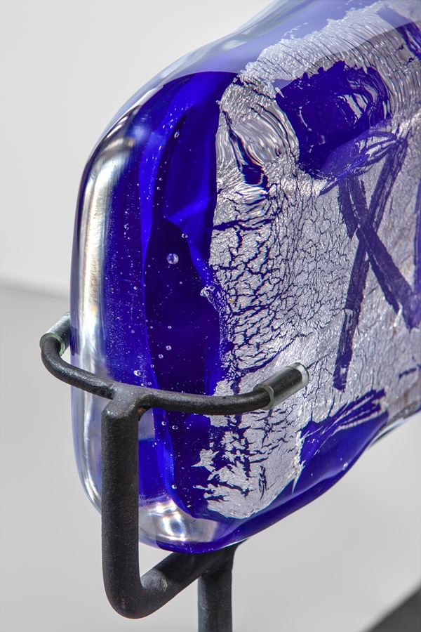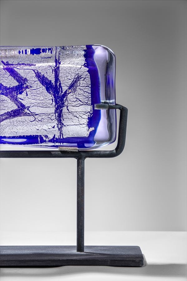 Vetro cristallo con inclusione di vetro violetto, supporto in metallo.