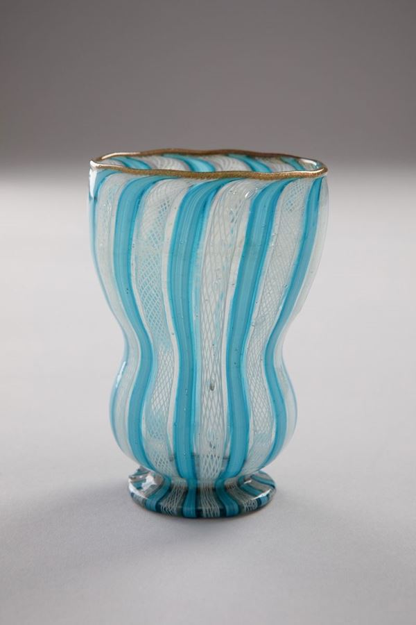 Vetro soffiato a canne acquamare e zanfirico, sottile bordo superiore applicato a caldo.