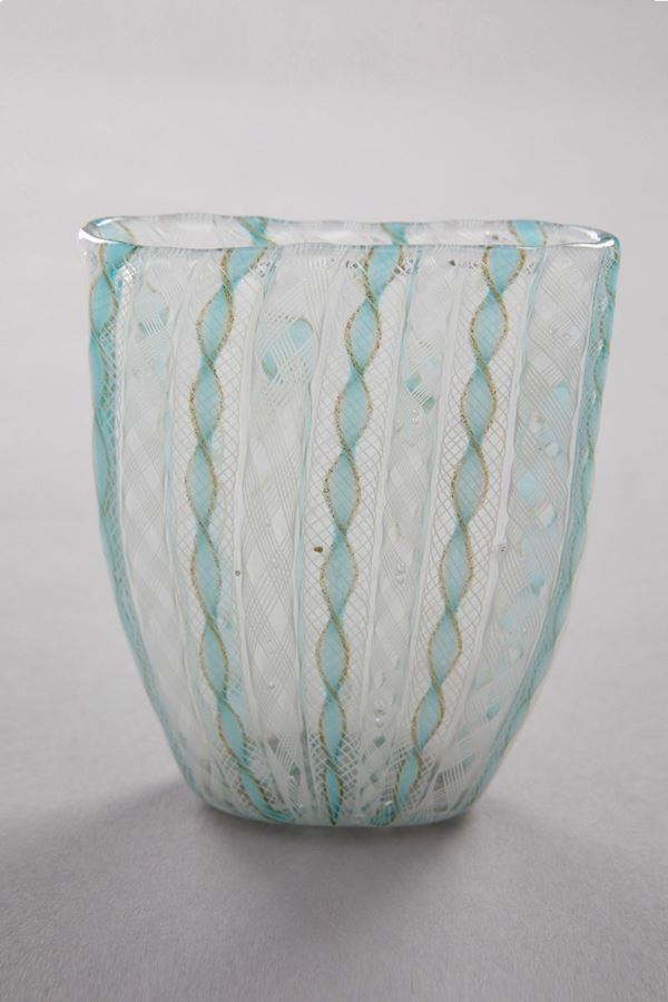 Vetro soffiato a canne, zanfirico e retortoli turchese con avventurina.